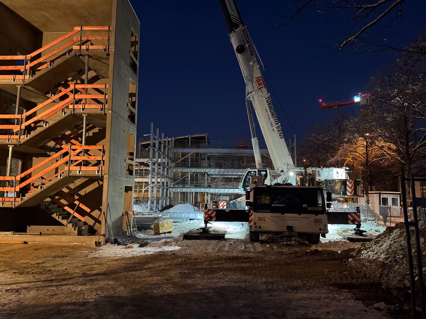 Unsere aktuellen „Helden der Baustelle“ befinden sich in Harlaching: Dort sind sie dabei, das Interimsparkdeck an der Seybothstraße zu montieren. Und das, obwohl im Baugewerbe die Zeit zwischen 1. Dezember und 31. März als offizielle „Schlechtwetterzeit“ gilt. Solange es zumutbar und sicher ist, sollen die Arbeiten trotz Nässe und Kälte voranschreiten. Neben den Treppentürmen, die bereits im Dezember betoniert waren, werden derzeit die Stützen gestellt und die ersten Decks festgeschraubt. Im Mai 2024 soll das Parkhaus mit rund 160 Stellplätzen in Betrieb gehen. Tolle Leistung!